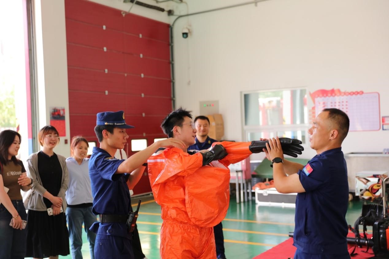 活动伊始,特勤一班班长王宇同志为各位党员介绍了液压扩张钳、无齿锯、戒指切割器、热敏成像仪等消防救援装备,以及激流救生衣、防化服、电绝缘服、避火服等消防救援特种防护装备。各位党员认真学习听取讲解,并且试穿体验了各类防护装备。在试穿体验之后,大家体会到了消防员战士在极端危险条件下穿着笨重装备抢险救援十分不易。