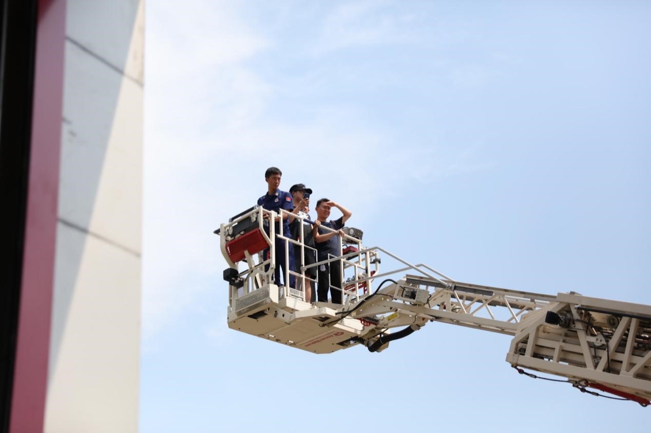 随后,在王宇的带领下各位党员参观了救援站的各类消防车。王宇详尽的讲解引起了大家广泛的兴趣,泡沫消防车强大的载水量和稳定的性能为消防救援任务提供强有力的保障,云梯消防车具有最大30米的工作高度和47米的水炮射程,可用于高层建筑灭火。在消防员同志的保护和指导下,各位党员同志依次登上消防云梯体验高空升降。