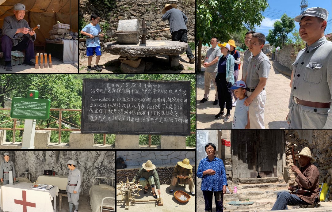 在土雷及手榴弹制作场,身着八路军服装的老兵讲解着“一硝二磷三木炭”的手榴弹和土雷制作方法;在“全民参展、团结对敌”的宣传标语下,沿途两位百姓正在纺纱、纳鞋底、做军鞋,为抗战贡献自己的力量;我们沿着古老的街巷继续行进,两位老人正在弹唱小调,曲调悲壮凄切,歌词讲述着白发双亲送儿打东洋,新婚妻子送夫去参军的真实历史,用国仇家恨和满腔热血谱写了一部可歌可泣的抗战史诗;在石磨前,党员同志们参与了手磨粮食的过程,亲身体验了战争年代的艰辛与困苦。