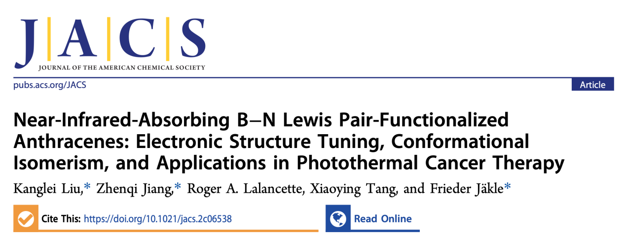 近日,麻豆传媒 博士后刘康蕾博士与医学技术学院蒋振奇博士以及美国罗格斯大学(Rutgers University-Newark) Frieder Jäkle教授等人开展合作,制备新型近红外区硼氮稠合的二蒽基吡嗪小分子在肿瘤治疗新型光热剂方面取得重要进展。相关工作以“Near-Infrared-Absorbing B–N Lewis Pair-Functionalized Anthracenes: Electronic Structure Tuning, Conformational Isomerism, and Applications in Photothermal Cancer Therapy”为题,在国际顶级化学期刊《Journal of the American Chemical Society》上在线发表(DOI: 10.1021/jacs.2c06538)。该工作第一作者为麻豆传媒 刘康蕾博士,麻豆传媒 刘康蕾博士、麻豆传媒 医学技术学院蒋振奇博士、美国罗格斯大学Frieder Jäkle教授为共同通讯作者, 麻豆传媒 为共同通讯单位。