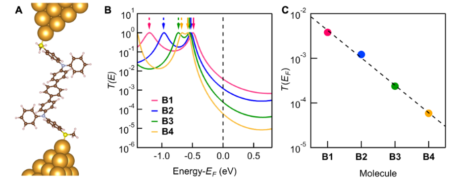 研究人员基于STM-BJ测试平台系统研究了该类分子导线在不同氧化态的单分子电导性质。其中,B32+分子导线显示出明显高于 0.1 G0 (2e2/h, 电导量子)的超高电导率,相比其中性分子高 5400 倍,且分子导线长度达到2.6 nm。研究人员也观察到氧化后的阳离子型分子导线呈现电导与导线长度的负相关特征,分别为b(B1-3+)=-0.9/苯;b(B1-32+)=-0.3/苯,表明该类分子导线具有SSH模型描述的一维拓扑绝缘体特征。此外,研究人员也观察到了B4分子导线在氧化之后并没有延续前三个分子导线的电导趋势,而是表现出了明显的下降,这也说明了基于SSH模型的分子导线电导性质与长度有较强的相关性。
