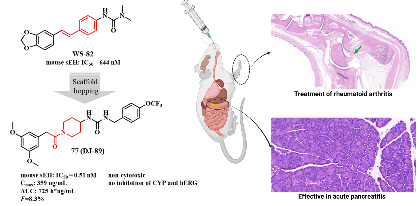 风湿性关节炎等慢性炎症性疾病因高致残率和现有药物副作用大、疗效不稳定等问题,而胰腺炎目前临床没有有效药物,长期面临治疗困境。sEH在炎症调控中至关重要,它代谢体内的有益的抗炎因子—环氧二十碳三烯酸,促使炎症发展,成为抗炎药物研发热门靶点。不过,此前进入临床II期试验的sEH抑制剂,因药代动力学缺陷或安全性问题折戟,目前没有任何药物被批准上市。这一现状使得开发具有全新化学骨架的药物变得尤为迫切,也极具重要意义。此前,我们设计了多种骨架的sEH抑制剂(European Journal of Medicinal Chemistry 2024, 266, 116113;European Journal of Medicinal Chemistry 2024, 280.;Journal of Medicinal Chemistry 2024, 67, 18412−18447;Journal of Medicinal Chemistry 2024, 67, 22168-22190.)。此次,我们基于“骨架跃迁”策略,从天然二苯乙烯衍生物出发,设计合成了九种新型骨架化合物,最终筛选出以“苯乙酰哌啶为核心骨架的DJ-89。该药物在多项实验中表现出色:1)超强抑制活性:DJ-89对sEH的抑制活性(IC50 = 0.51 nM)比临床候选药EC5026(19 nM)和TPPU(44 nM)高数十倍。2)独特抗炎机制:通过提升EETs水平并降低其代谢产物DHETs,DJ-89显著抑制促炎因子(TNF-α、IL-1β)水平,同时增加抗炎因子IL-10水平,这一“双效调节”机制具有创新性。3)体内显著疗效:在类风湿性关节炎大鼠模型中,DJ-89(10 mg/kg口服)有效减轻关节肿胀和骨侵蚀;在急性胰腺炎模型中,其抑制胰腺组织的炎症细胞浸润效果突出,同时血浆IL-6水平下降50%。4)优异安全性:对hERG和CYP酶影响微弱,大幅降低临床用药风险。5)药代动力学良好口服生物利用度达8.3%,半衰期1.89小时,且主要富集于sEH表达量高的肝、肾部位,脑部暴露量低,预示其全身抗炎作用显著且中枢副作用风险小。