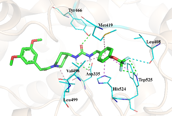 通过X射线晶体学解析了DJ-89与sEH复合物的共晶结构(PDB 编号: 9KPI),研究发现其苯乙酰哌啶骨架与sEH酶活性腔形成多重相互作用:脲基与Asp335、Tyr466形成氢键,增强结合能力;三氟甲氧基苄基通过π-π作用与His524结合,增强亲和力;哌啶环的构象约束减少分子柔性,增加了额外的相互作用力。相较于传统sEH抑制剂,DJ-89的独特结构使其在结合强度上实现提升。