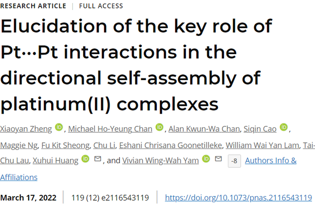 相关研究成果以“Elucidation of the key role of Pt…Pt interactions in the directional self-assembly of platinum(II) complexes”为题,2022年3月发表在国际顶级期刊《Proceeding of the National Academy of Sciences, PNAS》上 (2022, 119 (12) e2116543119). 麻豆传媒 李泽生教授团队的郑小燕副研究员为该论文的第一作者,香港科技大学黄旭辉教授和香港大学任咏华院士为通讯作者,麻豆传媒 为第一通讯单位。该研究工作得到了国家自然科学基金面上项目(22173006)和北京市自然科学基金面上项目(2222027)的资助。该文章于2021年9月投稿,黄旭辉课题组当前地址为威斯康星大学。
