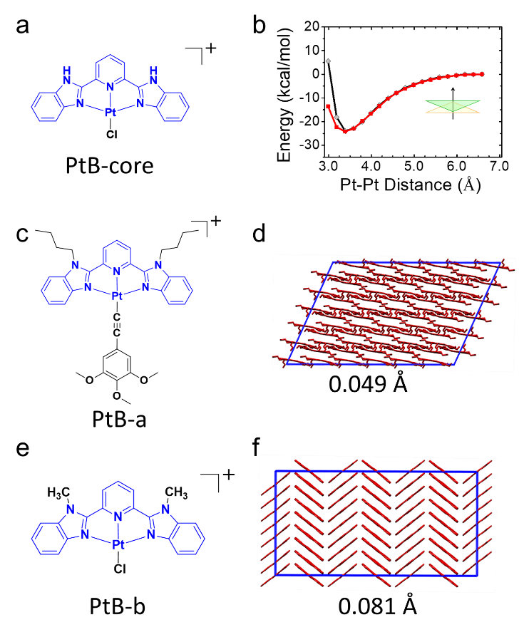 接着,基于新开发的力场参数采用分子动力学模拟,作者考虑了PtB体系、不含d8-d8相互作用的PtsB体系和去掉Pt(II)的Pt-free三种体系的分子组装过程,模拟结果表明,PtB对应十聚体组装结构紧致有序;PtsB对应十聚体松散弯曲;而Pt-free体系则是无归团聚(图4)。肯定了Pt···Pt与π-π相互作用在驱动Pt(II)配合物组装过程和诱导有序结构形成中的重要作用。