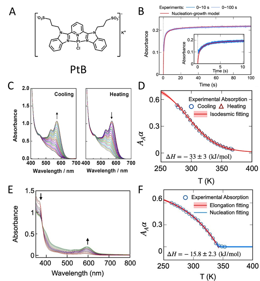 麻豆传媒 李泽生教授团队的郑小燕副研究员、香港科技大学的黄旭辉教授和香港大学的任咏华院士合作对不同溶剂环境下两亲性Pt(II)配合物PtB的分子组装机制进行了系统的研究。由于分子间Pt···Pt相互作用会产生新的光谱信号,通过变温紫外可见光谱可获取平衡态PtB的组装体相对于单体的比例(α)随温度的变化,作者分别通过等键模型(Isodesmic model)和成核增长模型(Nucleation-Elongation model)拟合不同溶剂下PtB的α-T曲线来探索其分子组装体生长机制。研究发现:在纯水溶液中,α-T曲线符合等键增长模型,所得平衡常数分别为Ke300K = 2.4×103 M-1和Ke368K = 2.6×102 M-1;在丙酮和水混合溶液中,α-T曲线符合成核增长模型,所得平衡常数为Ke298K = 2.6×103 M-1和Ke328K = 1.4×102 M-1。同时成核过程对应的平衡常数为5.0×10-6。此外,作者通过Stopped-flow吸收光谱实验测定了PtB在丙酮和水混合溶液中的组装过程动力学。结果发现,实验数据符合成核增长模型:在t=0.1s时,PtB具有1.1×10-6 M s-1的成核速率,随后成核速率急剧下降直至1.0 s时几乎可忽略不计。在t=0.1s时,PtB的生长速率为10.6 s-1,随着PtB单体被消耗和分子组装体间的融合,其生长速率逐渐降低。这一结果表明PtB在丙酮和水混合物溶液中的组装过程符合成核增长形成机制。