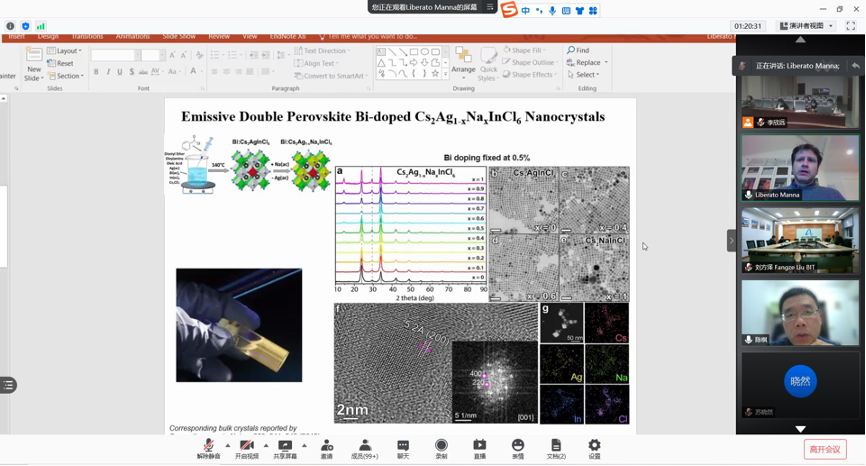 讲座中,Liberato Manna教授首先介绍了其再钙钛矿纳米晶液相合成工作的最新进展,包括离子交换策略和溶剂热调控,制备具有组分、能级、稳定性协同调控的高质量钙钛矿纳米晶。其中重要的进展包括薄膜掺杂、无铅钙钛矿纳米晶的合成、丰富的表面化学研究、各种实验技术和计算方法的结合等等。