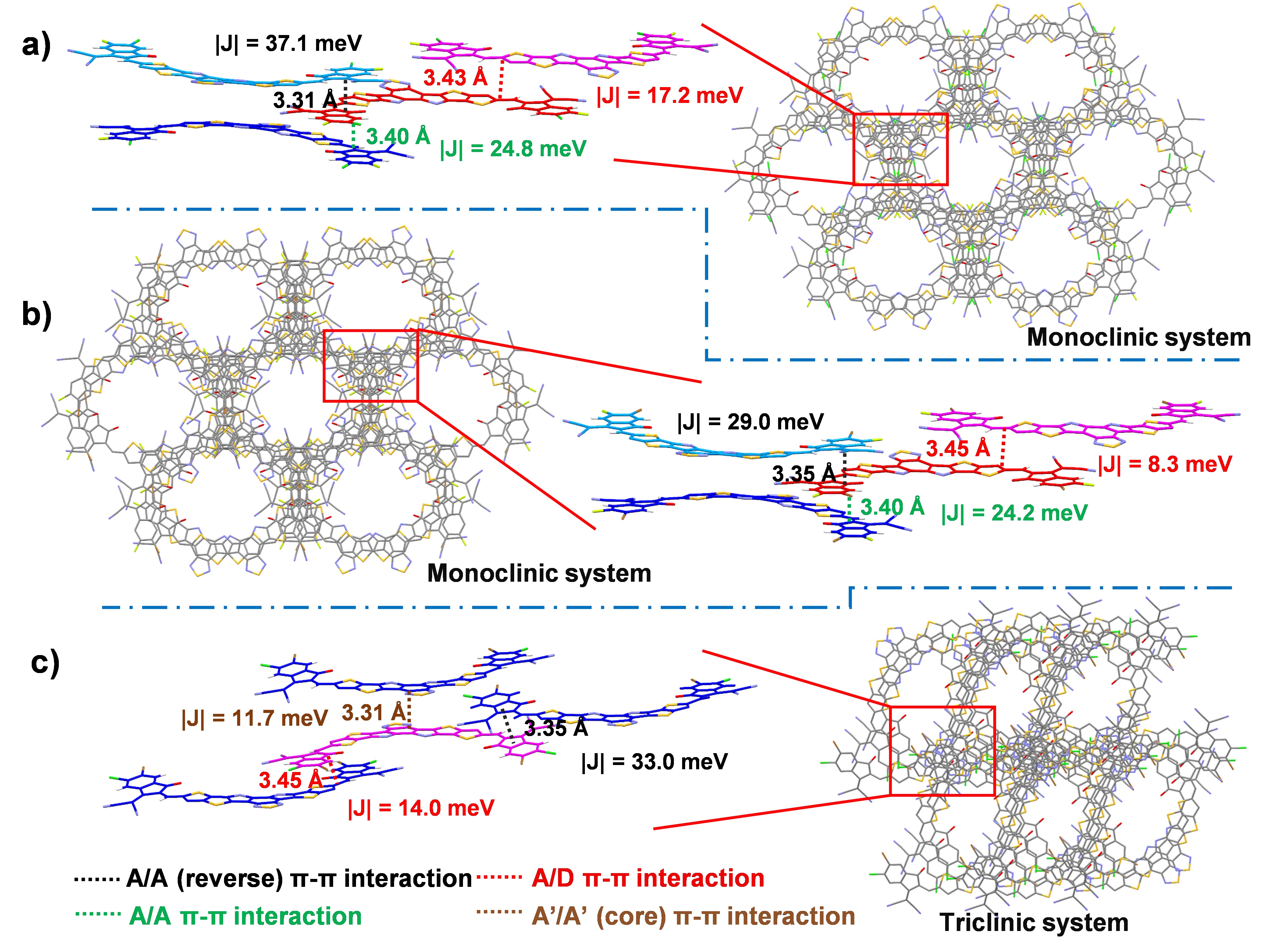 a) Y-BO-FCl; b) Y-BO-FBr; c)Y-BO-ClBr的分子结构、分子间晶体堆积模式和距离、分子间相互作用耦合量化参数对比。