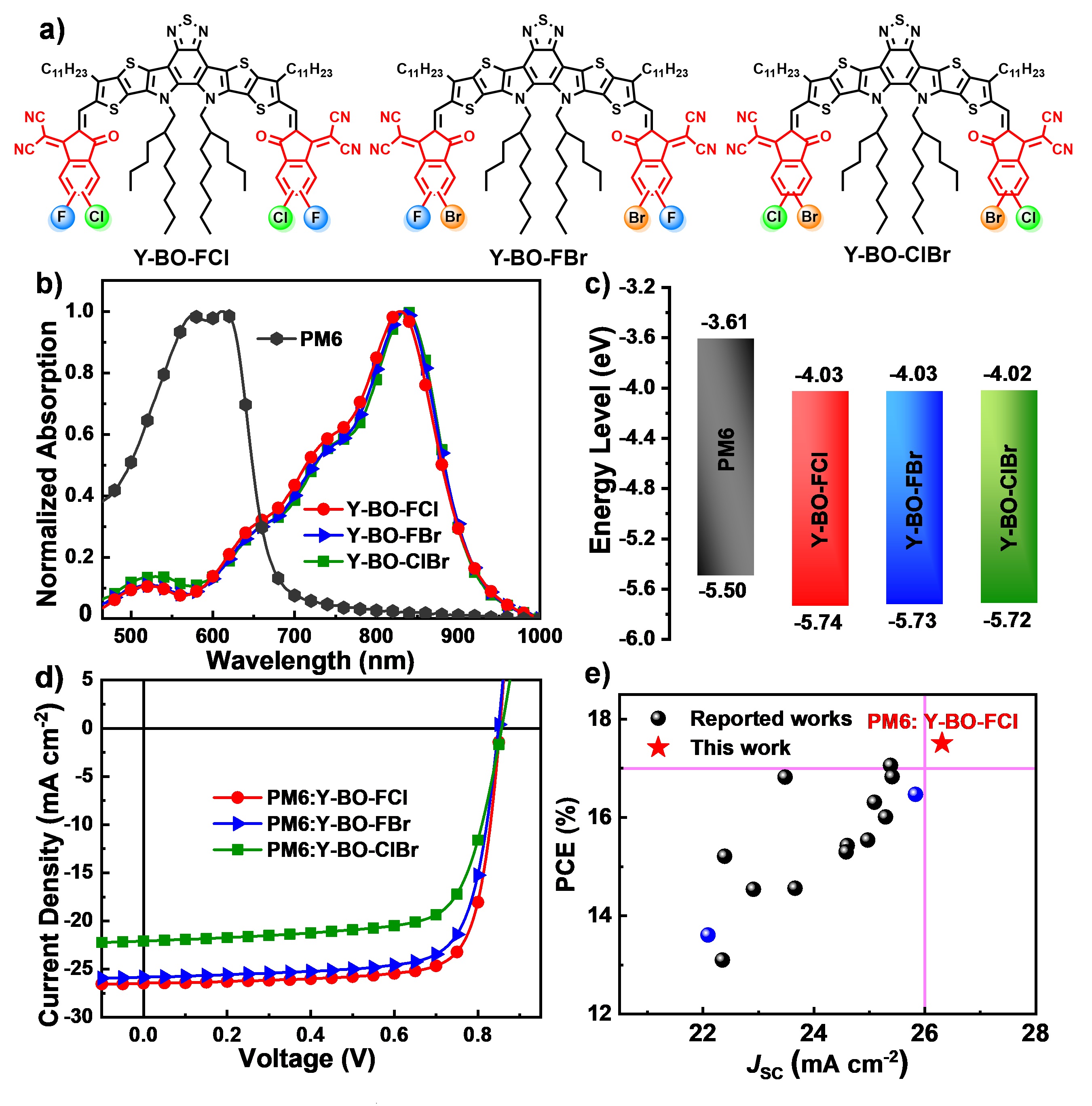 (e)受体分子Y-BO-FCl与其他已报道各种异卤素端基修饰的受体材料的二元电池性能统计对比图。