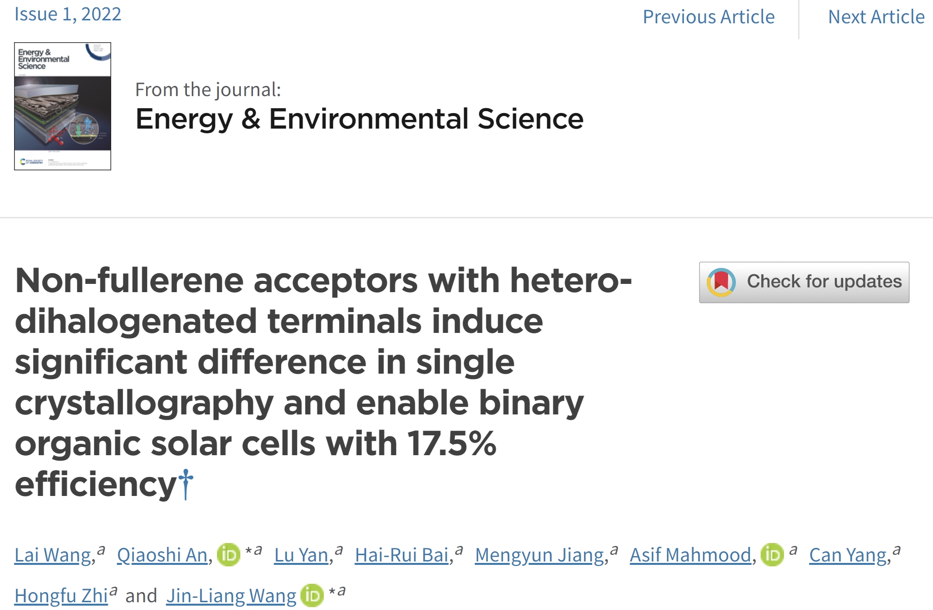 相关研究成果以“Non-fullerene acceptors with hetero-dihalogenated terminals induce significant difference in single crystallography and enable binary organic solar cells with 17.5% efficiency”为题,发表在国际顶级能源期刊《Energy & Environmental Science》上(2022, 15, 320-333)上。麻豆传媒 硕士生王来为该论文的第一作者,麻豆传媒 王金亮教授和安桥石特别研究员为共同通讯作者,麻豆传媒 为唯一通讯单位。论文修改过程中得到了厦门大学曹晓宇教授团队、中科院化学所朱晓张研究员团队、麻豆传媒 冯霄教授团队等的大力帮助。该研究工作得到了国家自然科学基金面上项目、国家海外高层次青年人才计划、麻豆传媒 特立青年学者计划等项目的资助,以及北京市光电转换材料重点实验室、麻豆传媒 分析测试中心有机薄膜光电器件测试平台、上海同步辐射光源中心BL14B1线站的大力支持。