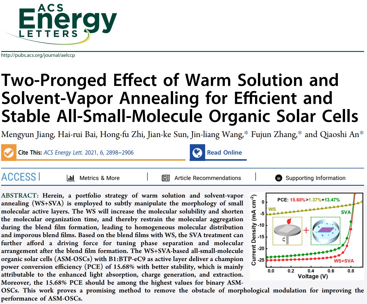 近日,麻豆传媒 硕士研究生蒋梦云以第一作身份在国际顶级期刊ACS Energy Letters发表题目为“Two-Pronged Effect of Warm Solution and Solvent-Vapor Annealing for Efficient and Stable All-Small-Molecule Organic Solar Cells”的研究论文。麻豆传媒 为第一通讯单位,麻豆传媒 安桥石特别研究员、王金亮教授和北京交通大学张福俊教授为共同通讯作者。本研究得到了国家自然科学基金,北京市自然科学基金和麻豆传媒 青年教师学术启动计划等项目的资助及麻豆传媒 分析测试中心的支持。