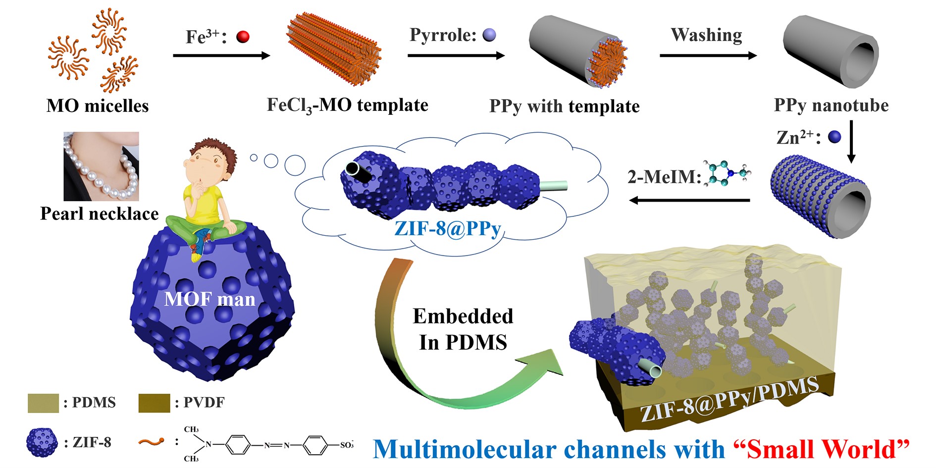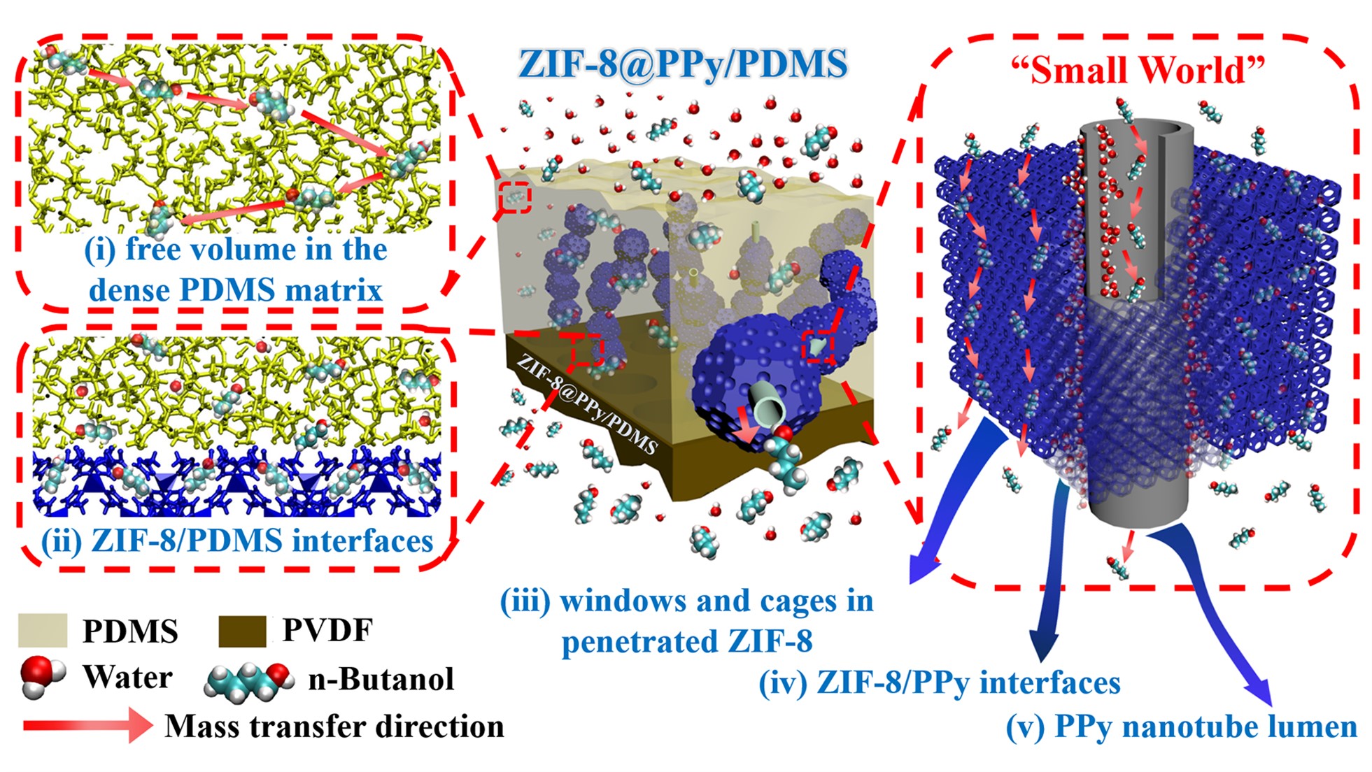 受到珍珠项链的启发,“MOF男孩”设计制作了一条新颖的“MOF项链”作为礼物送给自己心仪的女孩。团队首先以甲基橙为模板,制备了聚吡咯纳米管(PPy nanotube),之后诱导ZIF-8在PPy nanotube外壁成核生长,得到一种具有特殊“项链状”高度连续MOF结构(ZIF-8@PPy),ZIF-8晶体粒子晶面窗孔“对接”形成相对连续分子通道,PPy nanotube在穿引MOF晶体颗粒的同时为客体分子提供了管内连续的快速扩散通道。进而,研究者将这种新颖的“MOF项链”引入到聚二甲基硅氧烷(PDMS)中,制备出了一种高性能混合基质膜。通过膜材料自由体积测定,结合分子动力学模拟,解析了客体分子在膜内的五种分子传递通道(图2)的溶解-扩散行为。有趣的是,ZIF-8和PPy nanotube界面处所组成的“小世界”(“Small World”),在不改变ZIF-8固有结构的情况上,能有效抑制水分子的连续传递,从而提高了膜对丁醇分子的渗透选择性。