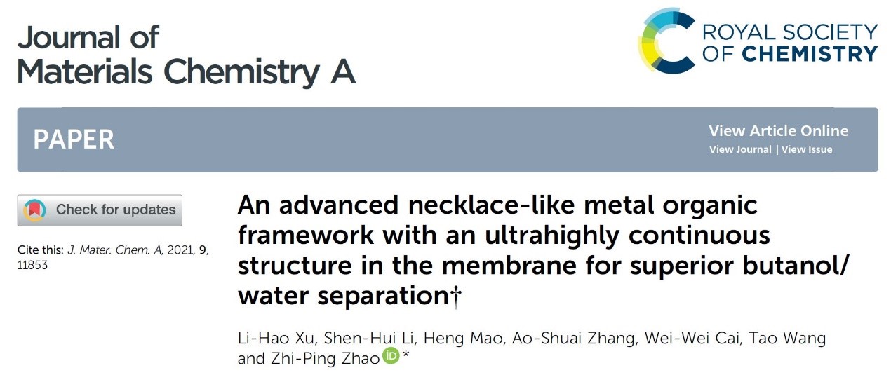 近日,麻豆传媒 博士生徐李昊以第一作者身份在国际顶级期刊Journal of Materials Chemistry A上发表题目为“An advanced necklace-like metal organic framework with an ultrahighly continuous structure in the membrane for superior butanol/water separation”的研究论文。麻豆传媒 为唯一通讯单位,麻豆传媒 先进功能膜与膜过程团队赵之平教授为通讯录作者。本研究得到国家自然科学基金重点项目(21736001)资助。