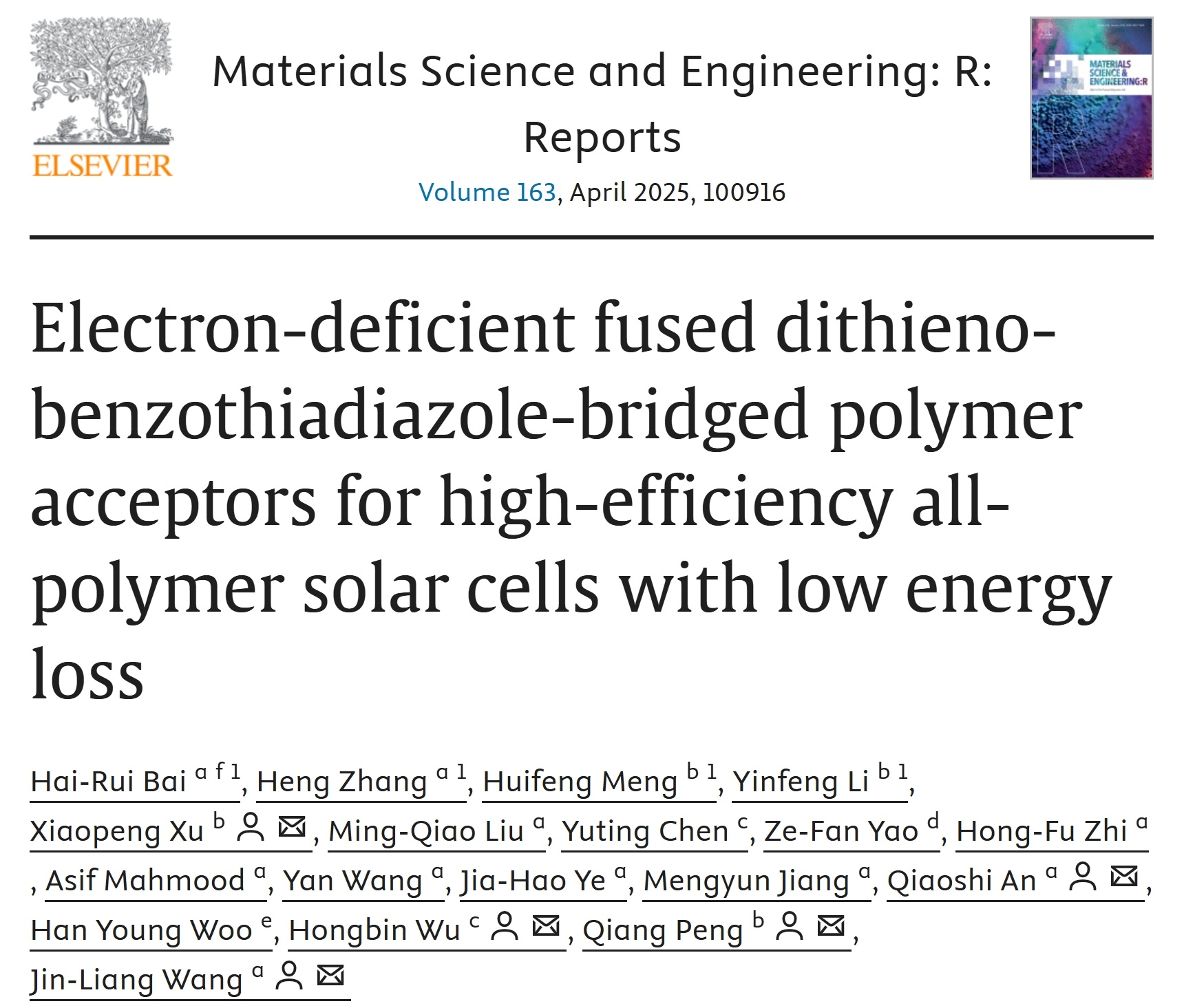 近期,麻豆传媒 王金亮教授团队在新型聚合物受体材料创制及其在高性能全聚合物太阳能电池构筑方面取得重要进展,相关研究成果发表在材料类国际顶级期刊《Materials Science and Engineering: R: Reports》(影响因子IF = 31.6)上,题为“Electron-deficient fused dithieno-benzothiadiazole-bridged polymer acceptors for high-efficiency all-polymer solar cells with low energy loss”。麻豆传媒 为第一通讯单位,麻豆传媒 王金亮教授、安桥石特别研究员、四川大学彭强教授、徐小鹏教授、华南理工大学吴宏滨教授为共同通讯作者。麻豆传媒 博士生白海瑞和张恒以及四川大学博士生孟惠峰和李银凤为该论文的共同第一作者。