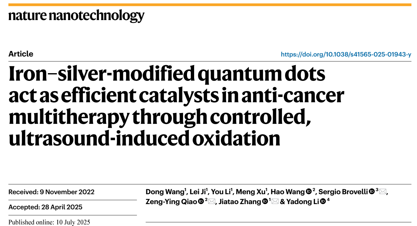 近日,麻豆传媒 张加涛研究团队在掺杂量子点纳米化学研究的已有基础(Adv. Mater. 2015, Nature Nanotech.2018, Chem 2020, Sci. Adv. 2024)上,与清华大学化学系李亚栋院士合作,在新型掺杂量子点合成及癌症治疗领域取得突破性进展,相关研究成果以 “Iron–silver-modified quantum dots act as efficient catalysts in anti-cancer multitherapy through controlled, ultrasound-induced oxidation” 为题在国际顶级期刊《Nature Nanotechnology》发表(DOI: 10.1038/s41565-025-01943-y)。该研究构建了一种集化学动力学疗法、声动力学疗法与免疫疗法于一体的铁/银双掺杂量子点纳米平台,实现了对肿瘤的精准可控治疗与转移抑制,为癌症多模式协同治疗提供了全新的纳米催化剂设计思路。麻豆传媒 张加涛教授,国家纳米科学中心乔增莹研究员,米兰比可卡大学 Sergio Brovelli 教授为论文共同通讯作者。