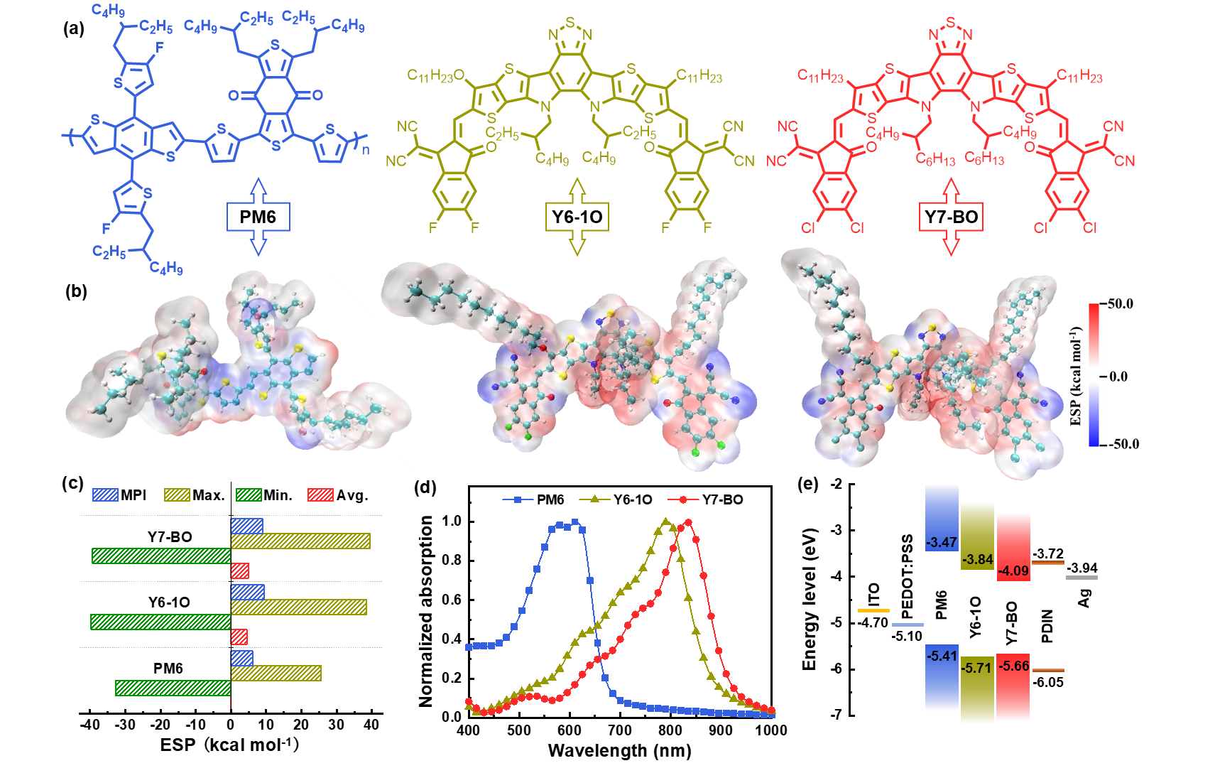 考虑到同源衍生物具有相似的分子结构和良好的兼容性,通过使用同构型小分子Y6-1O和Y7-BO作为受体,明星聚合物PM6作为给体来制备高性能三元器件。Y6-1O与Y7-BO具有类似的“BTP”稠环分子骨架,使得两个受体之间具有极好的兼容性,从而有利于精细调控三元共混物的形貌以获得优化的短路电流密度和填充因子。另一方面,不同的卤素取代端基和两个受体中不同的不对称或对称核心单元能够提供互补的吸收和可调节的能级,这有助于在短路电流密度与开路电压之间获得良好的平衡。