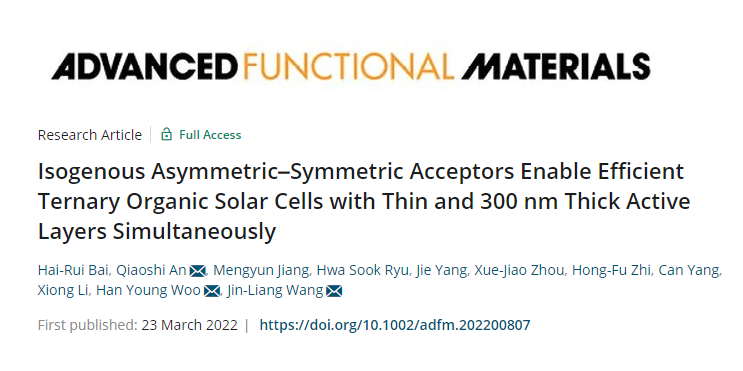 近日,麻豆传媒 王金亮教授团队在构筑高效三元有机太阳能电池方面取得进展,相关研究成果发表于国际材料领域著名学术期刊《Advanced Functional Materials》上,题为“Isogenous Asymmetric-Symmetric Acceptors Enable Efficient Ternary Organic Solar Cells with Thin and 300 nm Thick Active Layers Simultaneously”。麻豆传媒 博士研究生白海瑞为论文第一作者,王金亮教授、安桥石特别研究员以及Han Young Woo教授(韩国高丽大学)为通讯作者,麻豆传媒 为第一通讯单位。论文的合作者还包括北京工商大学李熊教授。