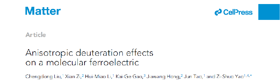 近日,麻豆传媒 姚子硕研究员在国际顶级期刊《Matter》发表题为“Anisotropic deuteration effects on a molecular ferroelectric”的研究论文。麻豆传媒 为唯一通讯作者单位,文章实验部分主要由麻豆传媒 研究生柳承东和李慧苗完成,麻豆传媒 宇航学院洪家旺教授在计算方面提供了帮助,姚子硕研究员为文章通讯作者。