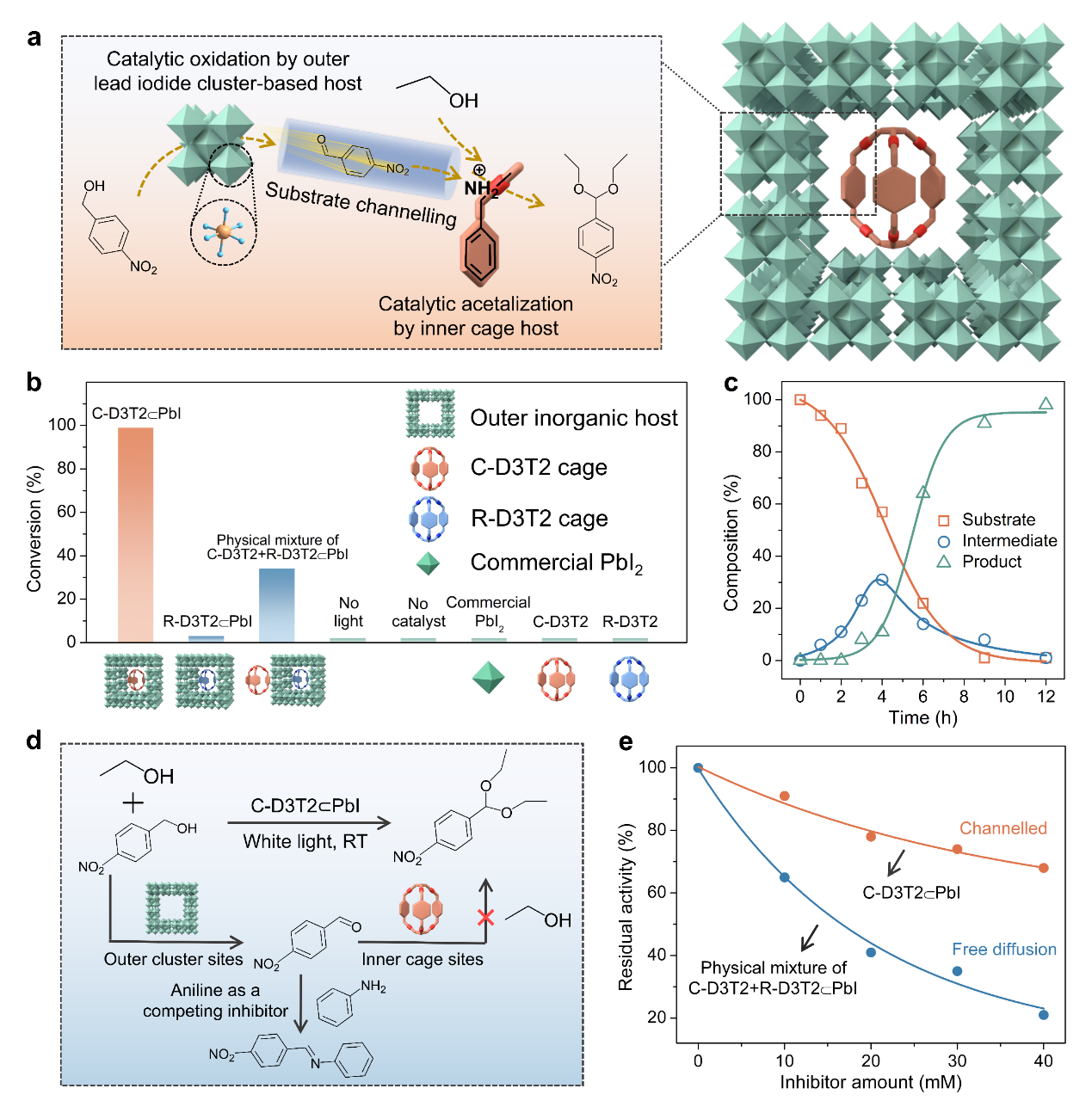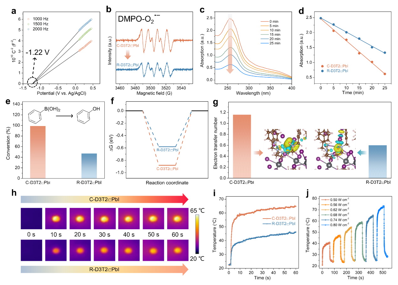 在该嵌套结构中,外部铅碘团簇框架与内部有机分子笼之间通过电荷转移作用产生了强烈的电子耦合,显著调控了铅碘团簇骨架的电子结构,从而赋予材料优异的光物理性能。具体而言,该电荷转移效应不仅有效提升了光热转换效率,还显著增强了材料对氧气的活化能力,为催化反应中的电子和能量传递提供了更加高效的路径。