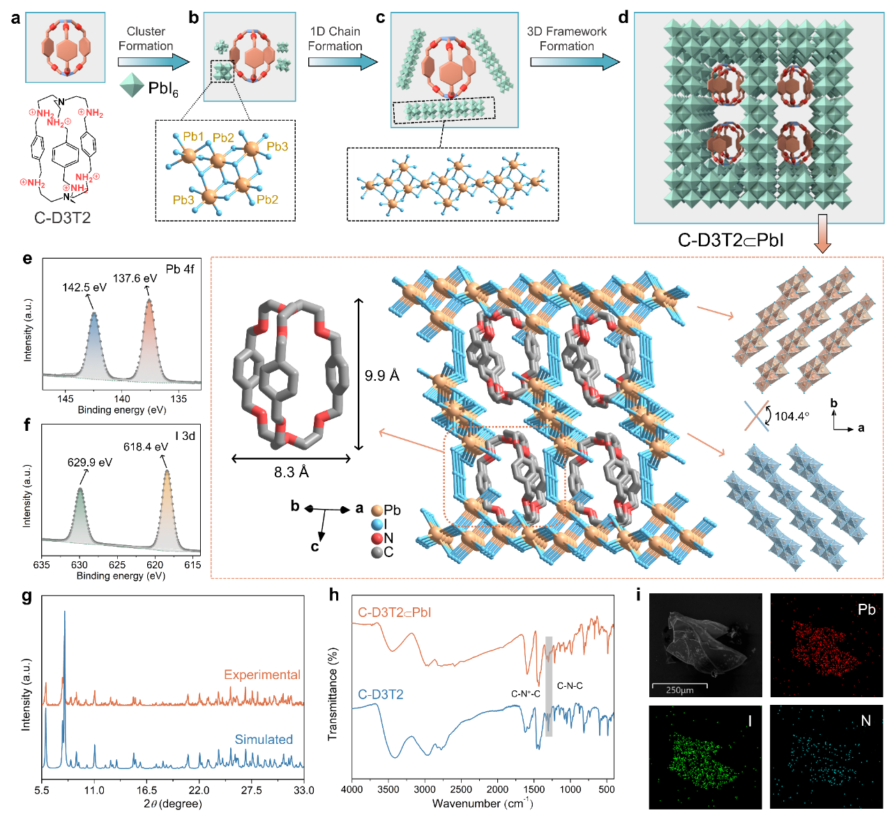 基于此,孙建科教授与杨国昱教授合作,采用荷正电的有机分子笼(C-D3T2)为构筑单元,借助静电作用与化学键耦合的组装策略,将其精准嵌入由铅碘团簇构成的三维框架通道中,成功构建了具有明确单晶结构的“主体主体”嵌套型多级次材料(C-D3T2PbI),在精准多级结构设计与合成领域取得了重要突破。