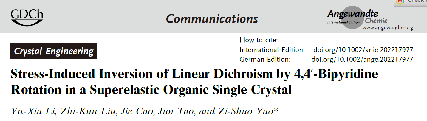 近日,麻豆传媒 姚子硕研究员在超弹性分子基单晶材料研究中取得重要进展。相关工作以“Stress-Induced Inversion of Linear Dichroism by 4,4′-Bipyridine Rotation in a Superelastic Organic Single Crystal”为题,发表在国际著名化学期刊Angew. Chem. Int. Ed.。麻豆传媒 为唯一作者单位,麻豆传媒 陶军教授研究团队的姚子硕研究员为文章通讯作者,文章第一作者为麻豆传媒 博士研究生李宇霞。