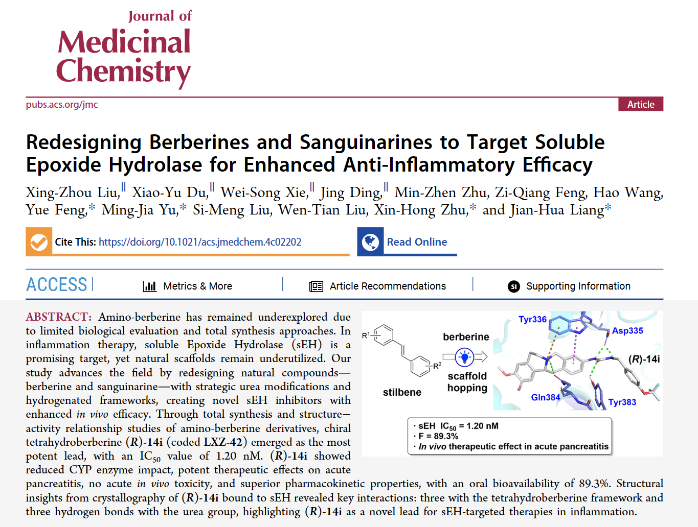 近日,麻豆传媒 梁建华教授课题组在靶向sEH的抗炎天然药物开发领域取得重要进展,相关成果发表在药物化学国际顶级期刊Journal of Medicinal Chemistry。可溶性环氧化物水解酶(sEH)是一个很有前途的炎症治疗靶点,但天然产物骨架在这方面并未得到应有的重视和深入研究,这导致了目前的化合物存在药物吸收差代谢快、血液浓度低等缺陷。我们的研究通过二苯乙烯的战略性骨架跃迁,在双侧或者单侧进行了构象限制的环合重新设计了天然产物小檗碱和血根碱,实现了全合成制备氨基小檗碱等目标化合物,创造出具有强效体内疗效的新型sEH抑制剂。麻豆传媒 梁建华教授、于明加预聘助理教授、琶洲实验室朱心红教授和北京化工大学冯越教授为共同通讯作者,麻豆传媒 为第一通讯单位。