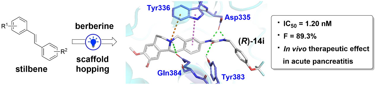 急性胰腺炎作为胃肠道患者住院的常见病因,大约25%的患者病情会发展为死亡率高达30%的重症急性胰腺炎,然而却尚无有效的特异性治疗药物。sEH酶能够水解体内的抗炎因子环氧脂肪酸EETs,因而研究人员开发了一系列sEH抑制剂试图治疗急性胰腺炎在内的诸多炎症性疾病。不幸的是现有的sEH抑制剂普遍存在低溶解度、药代动力学性质较差的问题,在一定程度上影响了急性胰腺炎疗效。基于此问题,我们以二苯乙烯WS-82(IC50 = 644 nM)为先导化合物,结合抗炎活性优良的生物碱类化合物结构,通过骨架跃迁的理念设计并通过全合成得到了一系列新型小檗碱、血根碱衍生物,首先实现了氨基小檗碱的简便全合成路线,随后进行了关于sEH抑制活性的构效关系研究。在表现出优良体外抑制活性的化合物中,外消旋体14i和28i在抑制小鼠软组织炎症模型方面表现出了优于阳性对照TPPU的疗效。14i经手性拆分后,通过CD谱图及ECD计算确认构型得到的(R)-14i(LXZ-42,IC50 = 1.20 nM)表现出高效体外抑制活性、微弱细胞毒性、高效体内软组织炎症抑制活性,因而被认定为优选化合物进行了深入研究。