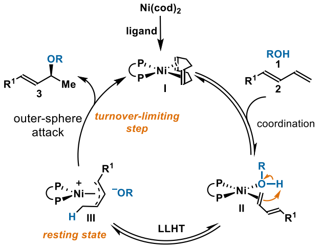 醚(C-O)键广泛存在于药物、农用化学品和功能材料中,其高效构筑吸引了研究者越来越多的关注。通常C-O键是通过Rh、Ru、Pd或Au等贵金属催化的炔烃或联烯的氢烷氧化反应来构筑(图1)。通过廉价易得的丰产金属(例如Ni)催化1,3-二烯的氢烷氧化来构建C-O键,最近引起化学家们的兴趣。然而Ni催化1,3-二烯的氢烷氧化反应目前主要面临两个挑战:1) Ni通常会可逆地活化C-O键,导致产物消旋化;2) 反应的区域选择性问题。为了解决这些挑战,近日麻豆传媒 杨小会课题组首次报道了无溶剂条件下Ni催化1,3-二烯的不对称氢烷氧化反应,能以高对映选择性和区域选择性地构筑C-O键(图1)。