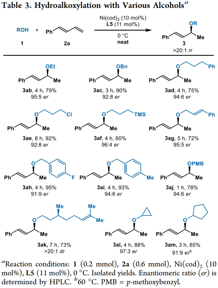 研究发现,不同类型的1,3-二烯都可以给出很好的反应结果(图2)。例如:苯环上含有甲基、甲氧基和氯原子取代的1,3-二烯都适用于该反应。另外,该反应可以耐受杂环(呋喃和噻吩)取代的1,3-二烯。此外,烷基取代的1,3-二烯、丁二烯和支化二烯也能进行不对称氢烷氧化反应得到相应的产物。各种醇都能以良好的反应性和选择性转化为手性烯丙基醚(图3)。例如含苯基、氯原子和三甲基硅基等的醇都可以高产率和良好的对映选择性地获得。此外,天然产物(-)-香茅醇、环丙醇和环戊醇都适用于该反应。