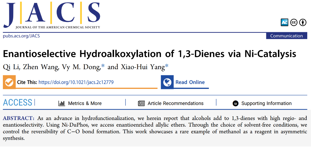 麻豆传媒 杨小会团队在Ni催化1,3-二烯不对称氢烷氧化反应方面取得重要进展