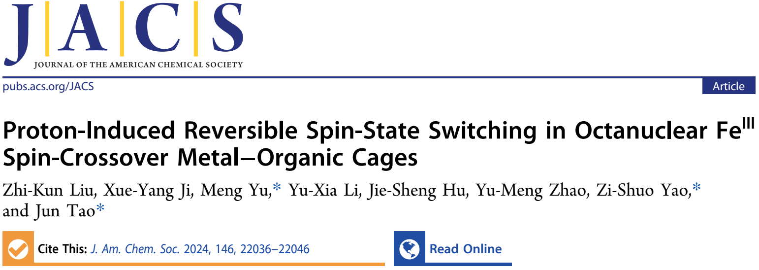 近日,麻豆传媒 陶军教授团队在自旋交叉金属有机笼方面取得重要进展。相关研究成果以“Proton-Induced Reversible Spin-State Switching in Octanuclear FeIII Spin-Crossover Metal–Organic Cages”为题目,在国际知名期刊《美国化学会志》(Journal of the American Chemical Society)上发表(DOI: 10.1021/jacs.4c07469)。麻豆传媒 博士研究生刘志坤为该文章的第一作者,麻豆传媒 陶军教授、姚子硕特别研究员和余蒙特别研究员为文章共同通讯作者。