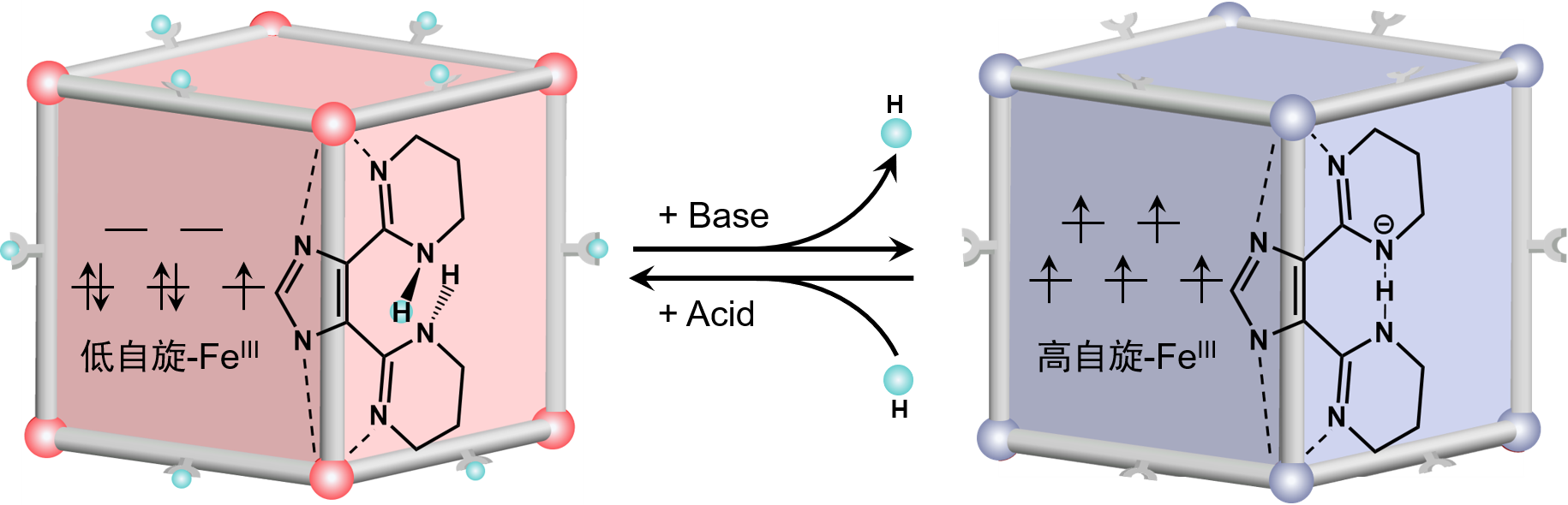 自旋交叉(spin-crossover, SCO)分子是一类能够在高-低自旋态之间可逆转换的磁性响应材料,其自旋转变具有高度的灵敏性,因此可用于设计刺激响应金属有机笼。但是,当前SCO-MOCs的研究集中于Fe体系,其空气敏感性限制其实际应用。另外,现有SCO-MOCs无法提供pH活性位点,难以胜任生物体内复杂酸碱环境的高精度传感任务。因此开发结构稳定、且具有pH磁响应功能的FeIII型SCO MOCs成为该领域的主要挑战之一。