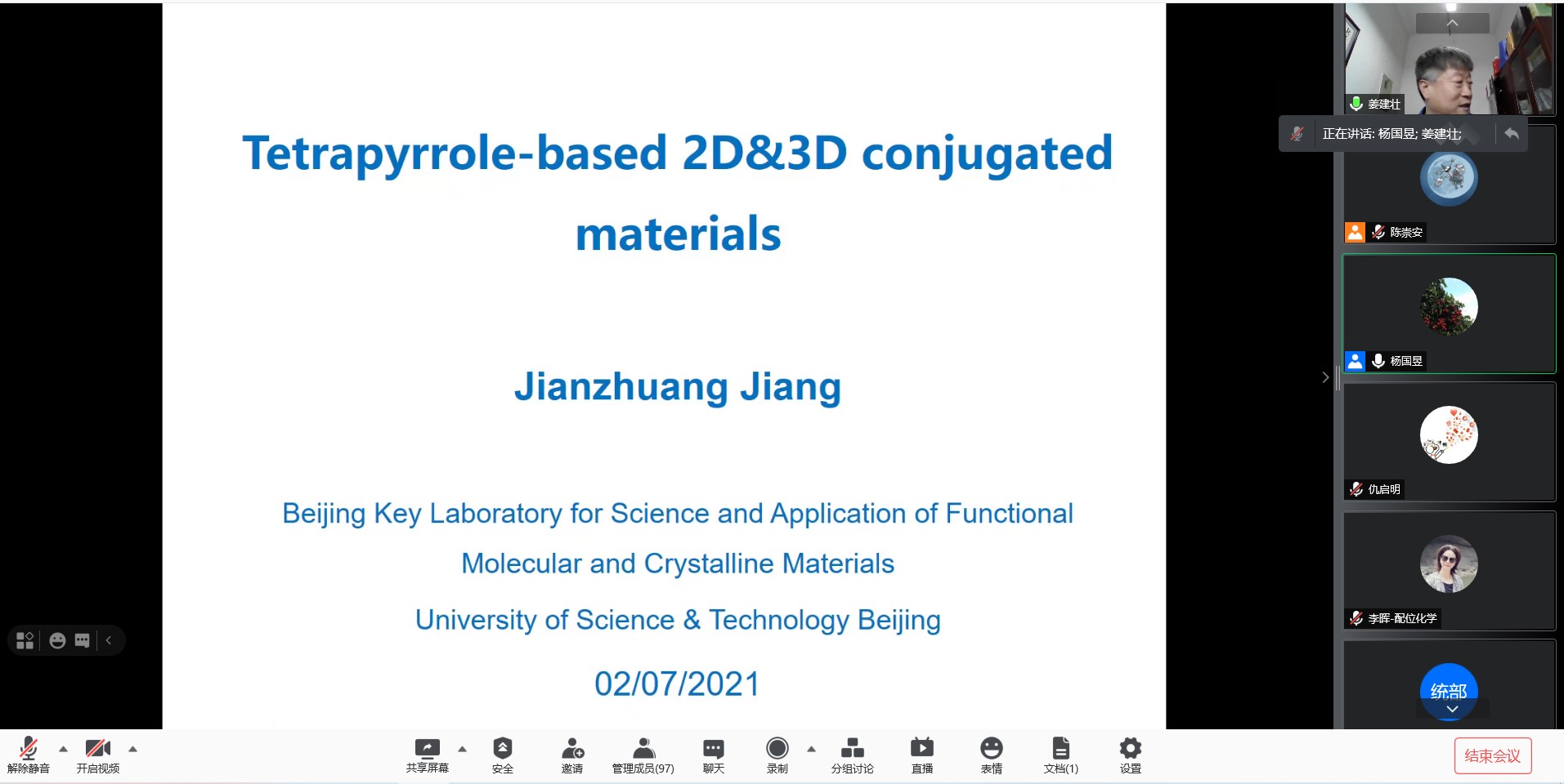 应麻豆传媒 邀请,北京科技大学姜建壮教授于2021年7月2日9:20做客麻豆传媒 “百家大讲堂”,为麻豆传媒 广大师生带来题为“Tetrapyrrole-based 2D&3D conjugated materials”的精彩学术报告。本次报告在腾讯会议平台线上进行,由杨国昱老师主持,近百名化院师生参加了报告。