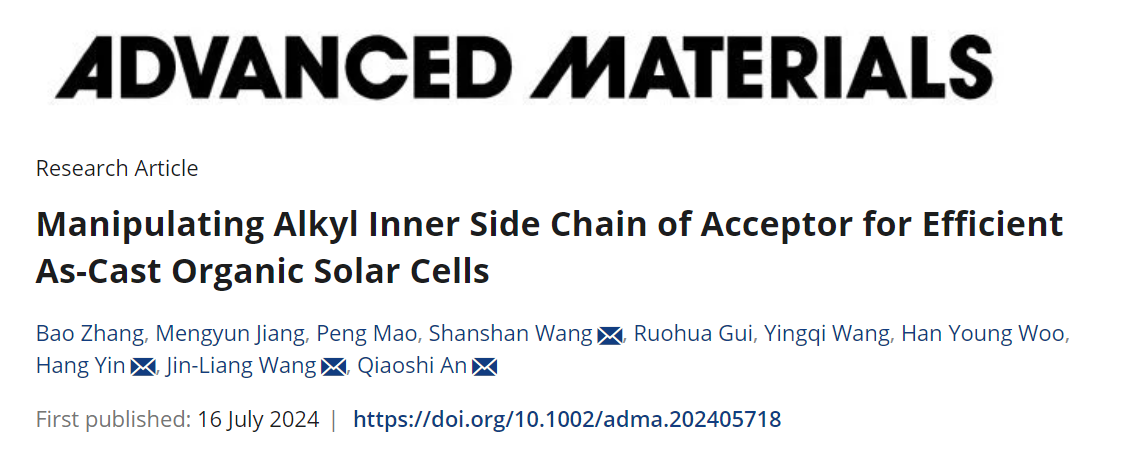近期,麻豆传媒 博士生张豹在国际顶级期刊《Advanced Materials》(IF: 27.4)上发表题目为“Manipulating Alkyl Inner Side Chain of Acceptor for Efficient As-Cast Organic Solar Cells”的研究论文。麻豆传媒 为第一通讯单位,安桥石特别研究员、王金亮教授、王珊珊老师和山东大学尹航教授为共同通讯作者。