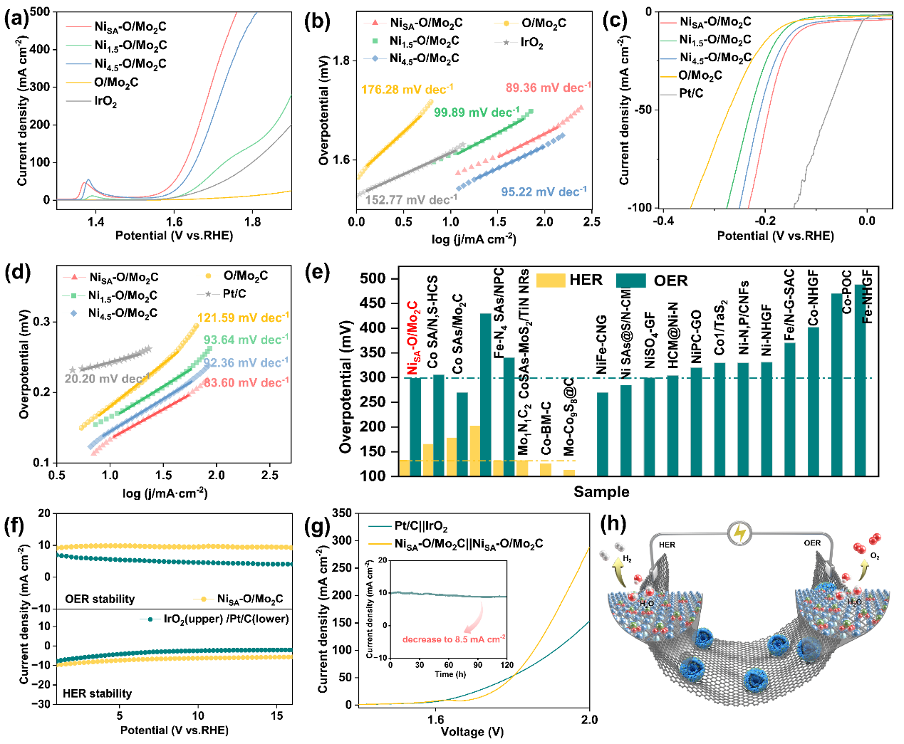 图3. 与O/Mo2C,Ni1.5-O/Mo2C以及Ni4.5-O/Mo2C相比下NiSA-O/Mo2C的电化学性能表征。