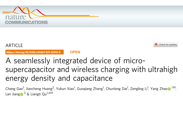 近日,麻豆传媒 博士生高畅以第一作者身份在Nature Communications期刊发表题目为“A seamlessly integrated device of micro-supercapacitor and wireless charging with ultrahigh energy density and capacitance”的研究论文,于2021年5月11日在线发表,论文链接://www.nature.com/articles/s41467-021-22912-8。麻豆传媒 为第一通讯单位,麻豆传媒 赵扬特别研究员和清华大学化学系曲良体教授为共同通讯作者,麻豆传媒 机械与车辆学院姜澜教授为本研究的合作者。本研究得到了国家重点研发计划项目、国家自然科学基金和北京市自然科学基项目等支持。