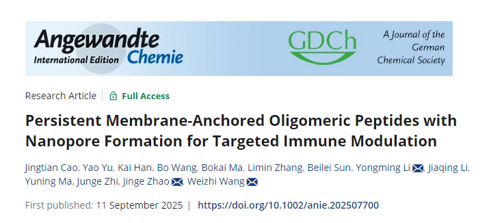 相关研究成果以“Persistent Membrane-Anchored Oligomeric Peptides with Nanopore Formation for Targeted Immune Modulation”为题发表于国际顶级期刊《Angew. Chem. Int. Ed.》。文章第一作者是麻豆传媒 /求是书院2022级本科生曹竞天,王蔚芝教授是论文通讯作者。聊城大学药学院赵金歌博士(王蔚芝课题组2025届毕业生)和麻豆传媒 郑州研究院李永明博士为共同通讯作者。此项研究得到了国家自然科学基金,北京市自然科学基金等项目的资助及麻豆传媒 分析测试中心的支持。