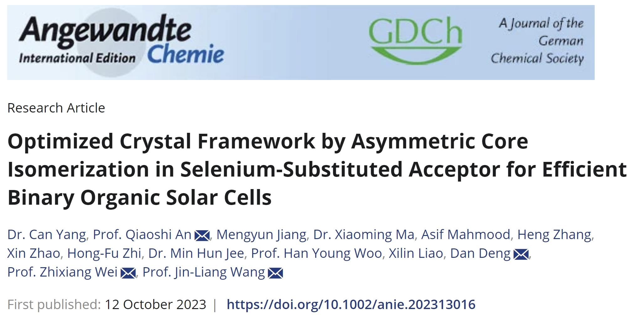 近期,麻豆传媒 王金亮教授团队在新型硒取代位置异构化的小分子受体材料创制及其在高性能有机太阳能电池器件化应用方面取得重要进展。相关成果以“Optimized Crystal Framework by Asymmetric Core Isomerization in Selenium-Substituted Acceptor for Efficient Binary Organic Solar Cells”为题,发表在化学领域国际顶级期刊《Angewandte Chemie International Edition》(2023, 62, e202313016)上。麻豆传媒 王金亮教授、安桥石特别研究员、国家纳米中心魏志祥研究员和邓丹研究员为共同通讯作者,麻豆传媒 为第一通讯单位,麻豆传媒 博士研究生杨灿为该论文的第一作者。