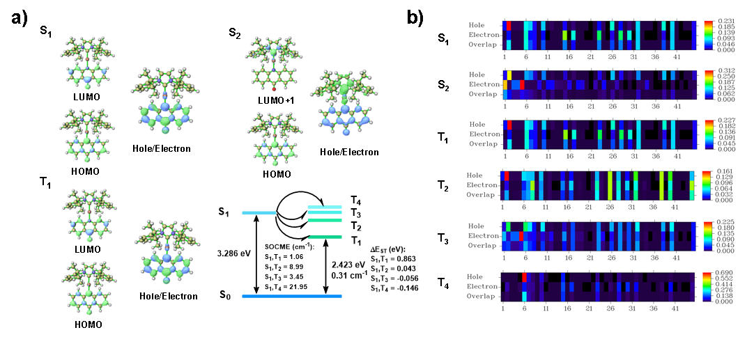 图3. a). IPrAuAcd 激发态的空穴(蓝色)/电子(绿色)图以及第一单重态激发态与三重态激发态之间的自旋-轨道耦合矩阵元(SOCME)。b). 原子对空穴和电子贡献的热图。编号 1 的原子是金原子