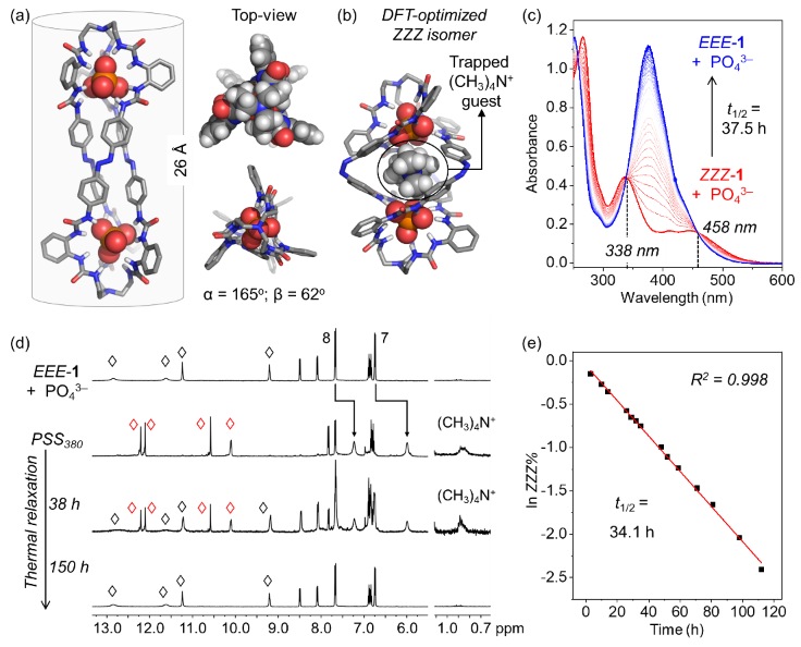 四面体硫酸根(SO₄²⁻)和磷酸根(PO₄³⁻)阴离子与三足六脲骨架全反式(EEE)分子笼的空腔结构高度互补,通过晶体结构、核磁、质谱等证实分子笼能够与硫酸根、磷酸根离子形成1:2的高度螺旋状的配位构象。理论计算和核磁实验证实:全顺式分子笼在保持阴离子配位的同时可封装TMA+阳离子,进而提高了全顺式ZZZ异构体的稳定性;相比于EZZ和EEZ两个中间异构体,ZZZ异构体的吉布斯自由能明显降低。核磁和紫外动力学跟踪实验表明,硫酸根、磷酸根离子配位分子笼表现为缓慢、一步式异构化行为(图2,热弛豫半衰期为34.1小时)。