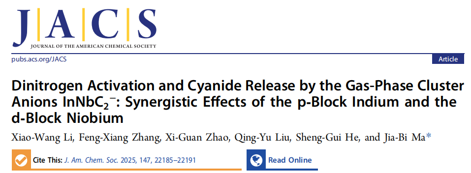 近日,麻豆传媒 马嘉璧课题组在气相团簇化学领域取得重要进展,相关研究成果以“Dinitrogen Activation and Cyanide Release by the Gas-Phase Cluster Anions InNbC2–: Synergistic Effects of the p-Block Indium and the d-Block Niobium”为题在国际顶级期刊《J. Am. Chem. Soc》发表。