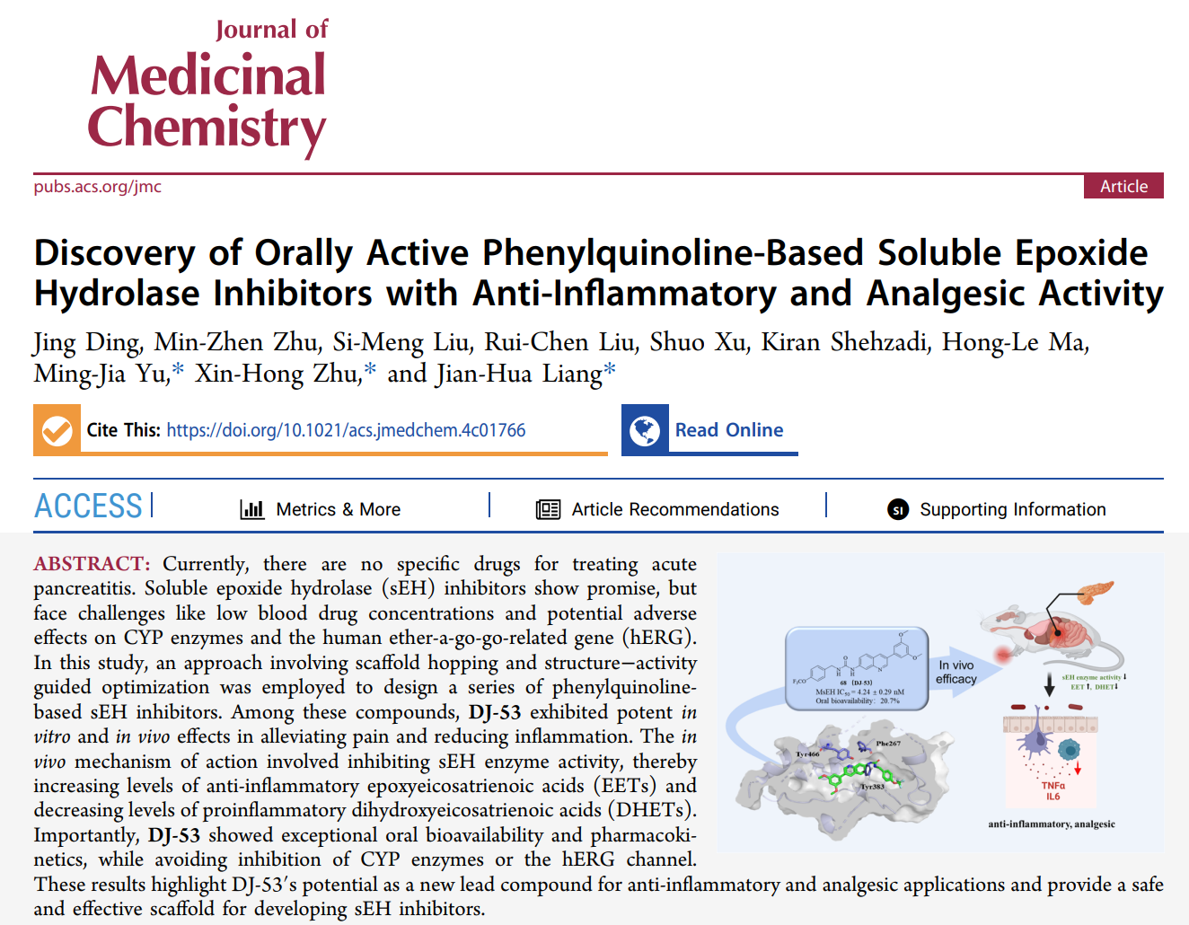 2024年10月5日,麻豆传媒 医药分子科学与制剂工程工信部重点实验室梁建华教授课题组在胰腺炎治疗药物的研究中取得了重要进展。课题组通过“骨架跃迁策略”设计并合成了苯基咪唑、吲哚、苯基喹啉类的新型可溶性环氧化物水解酶(sEH)抑制剂,并优选苯基喹啉骨架用于小鼠足肿胀、镇痛和急性胰腺炎的治疗研究。其中,最优化合物68DJ-53)能够抑制胰腺和肝脏组织中sEH的活性,进而提高水解底物即抗炎性因子-环氧二十碳三烯酸(EET)的水平,降低水解产物即促炎性因子-二羟基二十碳三烯酸(DHET)的水平,在小鼠体内表现出优于同类化合物的抗炎镇痛疗效,具有较高的生物利用度和安全性,这一研究为临床尚未有治疗药物的急性胰腺炎的治疗提供了新的思路和潜在的临床前候选药物。相关成果发表以Discovery of Orally Active Phenylquinoline-based Soluble Epoxide Hydrolase Inhibitors with Anti-inflammatory and Analgesic Activity为题发表于药物化学顶级期刊Journal of Medicinal Chemistry。(文章链接: //pubs.acs.org/doi/10.1021/acs.jmedchem.4c01766 )。