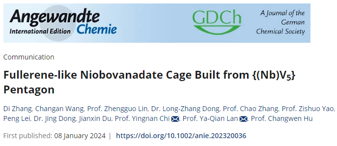 近期,麻豆传媒 胡长文教授和迟瑛楠教授团队在基于{Nb(V5)}五角星的类富勒烯铌钒笼簇构筑方面取得重要进展。相关成果以“Fullerene-like Niobovanadete Cage Built from{Nb(V5)} Pentagon”为题,发表在化学领域国际顶级期刊《Angewandte Chemie International Edition》(2024, e202320036)上。麻豆传媒 迟瑛楠教授和华南师范大学兰亚乾教授为共同通讯作者,麻豆传媒 为第一通讯单位,麻豆传媒 博士研究生张迪为该论文的第一作者。