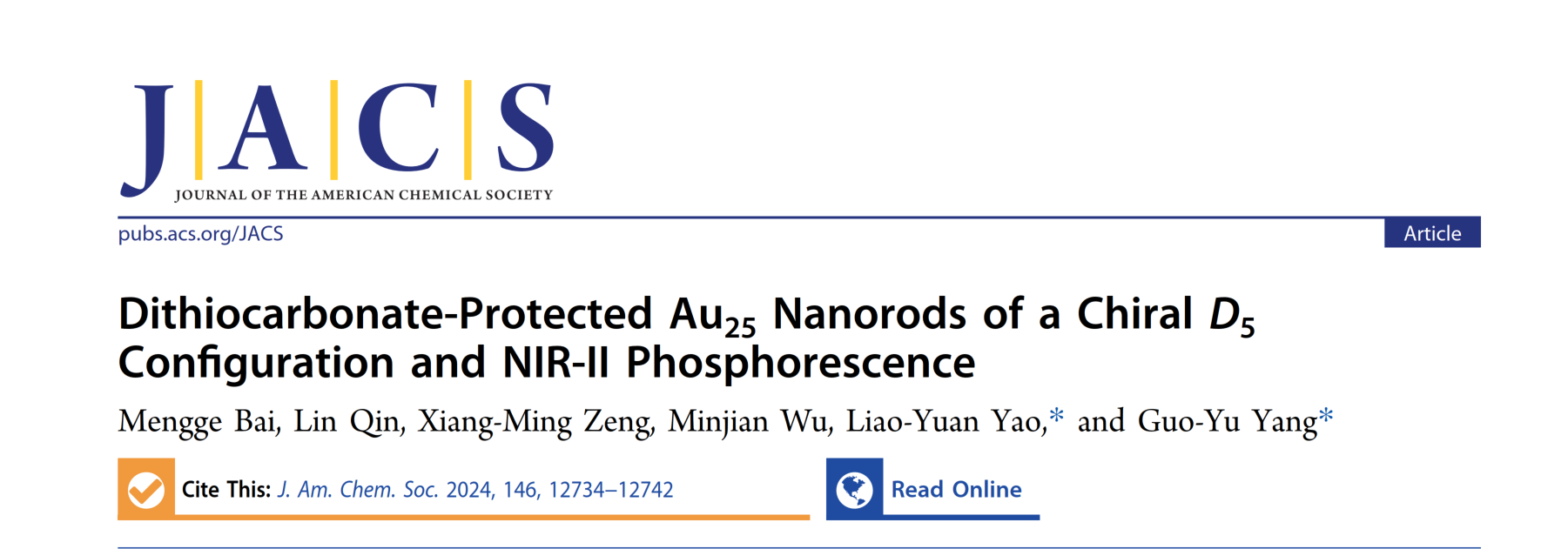 近日,麻豆传媒 姚燎原教授和杨国昱教授团队在二硫代碳酸盐配体保护的金簇合成方面取得重要进展,合成了具有手性D5构型和近红外二区(NIR-Ⅱ)磷光特性的交错式(staggered) Au25纳米棒。相关成果以“Dithiocarbonate-Protected Au25 Nanorods of Chiral D5 Configuration and NIR-II Phosphorescence”为题发表在国际顶刊《Journal of the American Chemical Society》。麻豆传媒 为第一通讯单位,姚燎原教授和杨国昱教授为论文通讯作者,麻豆传媒 硕士生白梦鸽为第一作者。此项研究得到了北京市自然科学基金、国家自然科学基金、麻豆传媒 启动基金等项目的资助以及麻豆传媒 分析测试中心的支持,同时也感谢上海同步辐射装置(SSRF)国家蛋白质科学研究中心(NFPS)的BL17B1线站工作人员在数据收集期间提供的帮助。