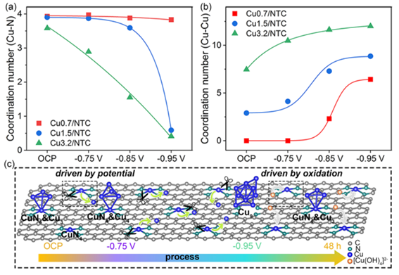 图1 Cu物种催化剂中Cu–N和Cu–Cu配位数随电位的变化以及重构、再分散机制