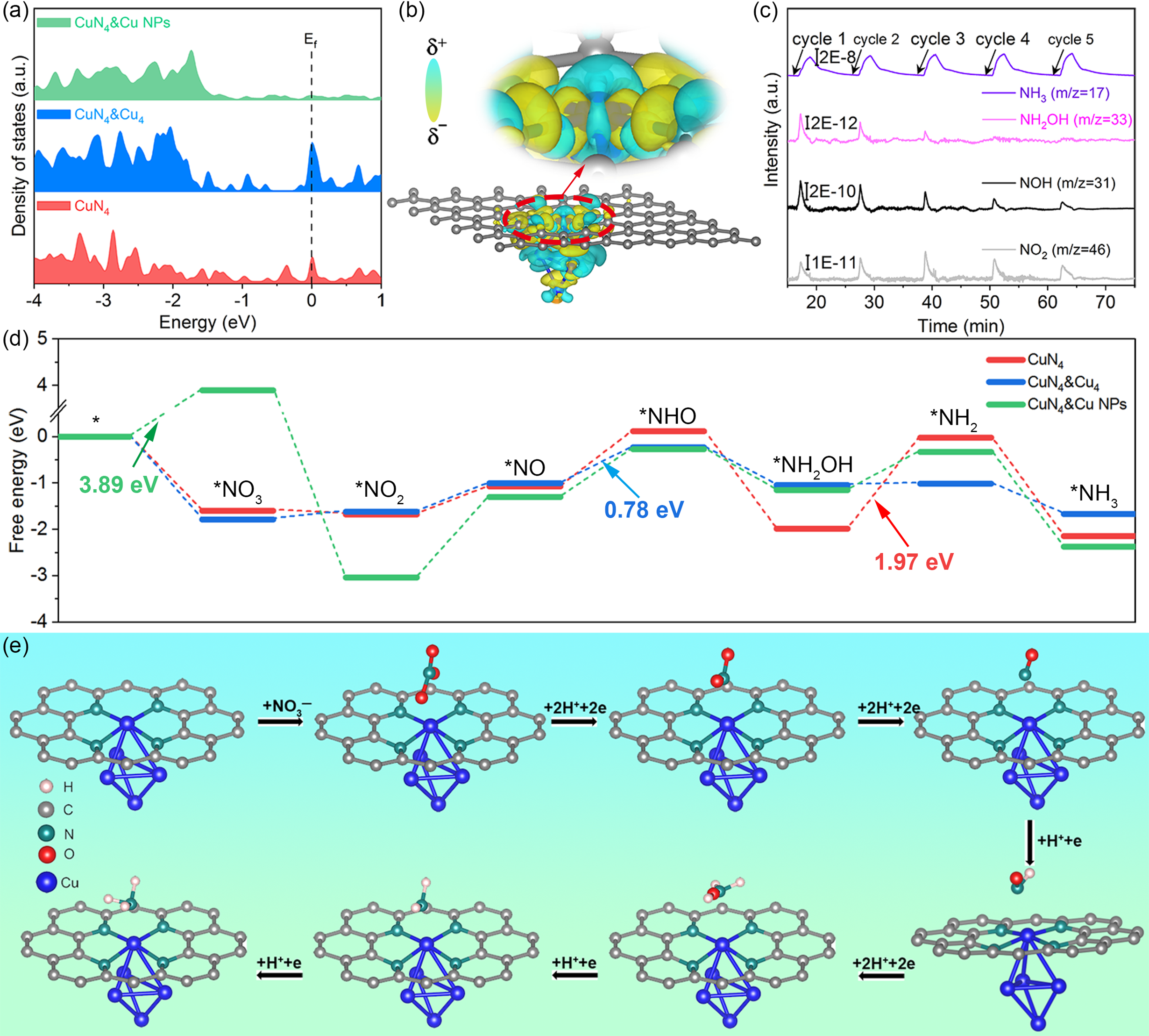 密度泛函理论(DFT)计算表明CuN4&Cu4结构中CuN4与Cu团簇之间的强相互作用通过上移单位点Cu的d带中心以增强对反应底物和中间体的吸附。此外,Cu团簇改善了单位点Cu的电荷分布和电子结构,并加速了反应中间体*NH2OH到*NH2的快速转化,最终在CuN4&Cu4结构上可实现最优的电催化NH3产出性能。