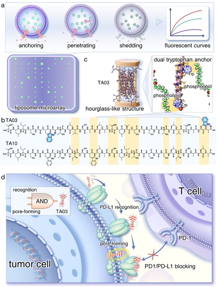 图1 多肽超分子的筛选与设计。a) 多肽纳米孔道筛选方法的建立。b) 纳米孔道多肽分子。c)色氨酸锚定细胞膜示意。d) 纳米孔道实现免疫检查点阻断。