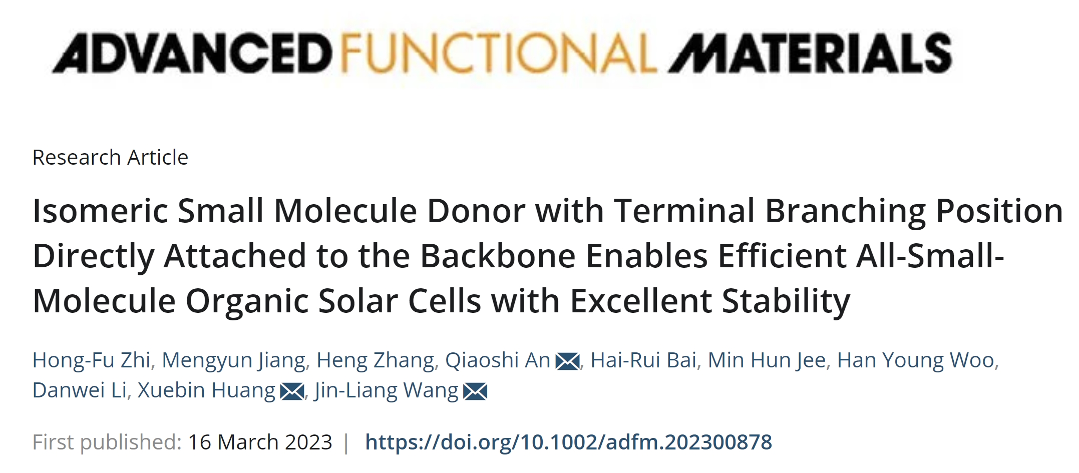 王金亮教授团队在异构化小分子给体材料合成及其在高效率兼具稳定性好的全小分子有机太阳能电池的应用研究方面取得重要进展,相关研究成果发表在材料类国际顶级期刊《Advanced Functional Materials》(DOI: 10.1002/adfm.202300878)上,题为“Isomeric Small Molecule Donor with Terminal Branching Position Directly Attached to the Backbone Enables Efficient All-Small-Molecule Organic Solar Cells with Excellent Stability”。麻豆传媒
