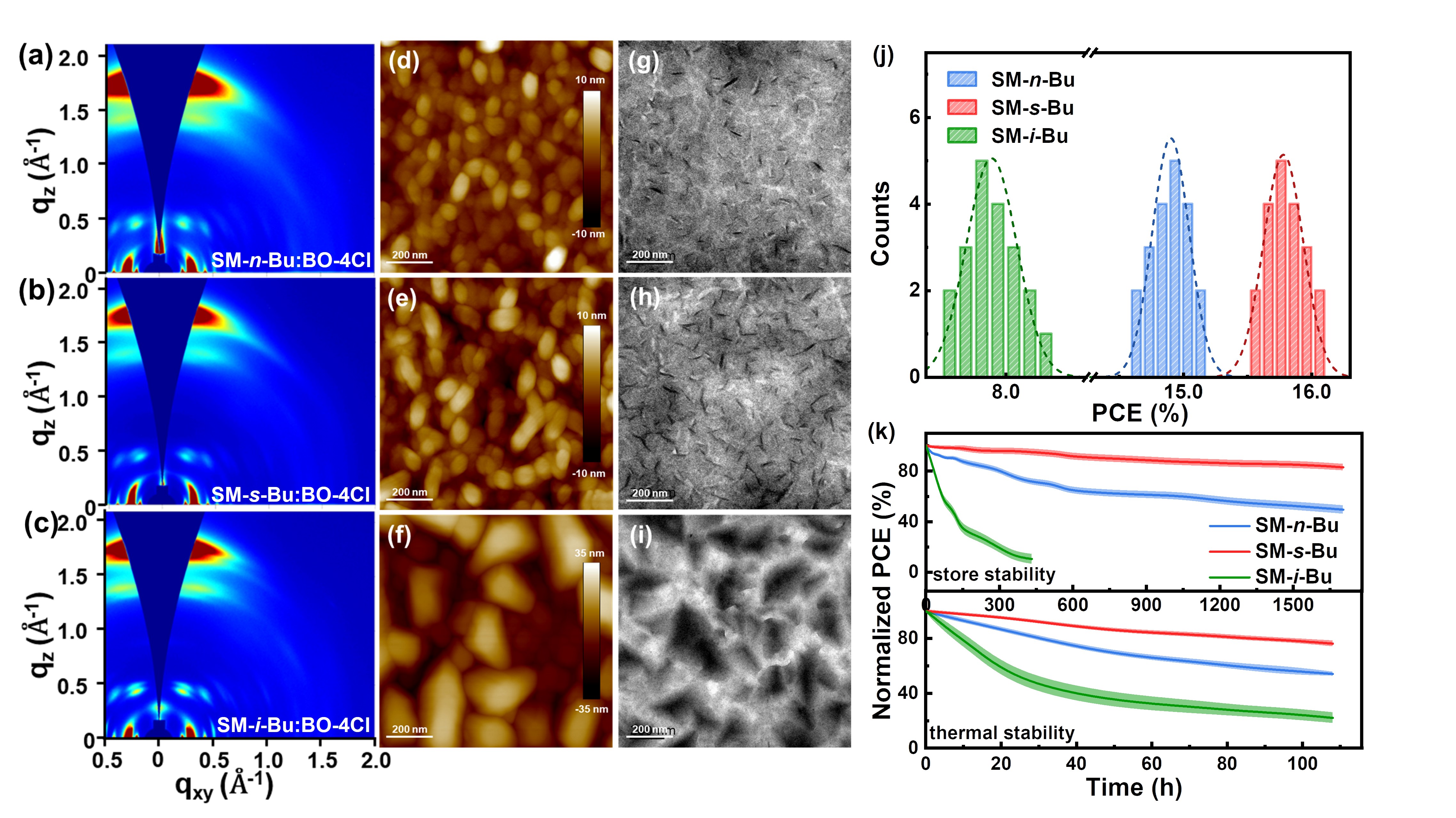 相应的模型化合物的单晶结构展现出明显的差异性。与另外两个晶体的层状滑移堆积模式相比,末端烷基异构分叉点最临近罗丹宁骨架的晶体结构(T-s-Bu)具有更紧密的鱼骨状堆积模式,表明末端烷基链异构化调控可以精细调控分子间晶体堆积模式。尽管这些小分子异构化给体材料具有相似的吸收和HOMO/LUMO能级, SM-s-Bu:BO-4Cl共混膜具有更合适的相分离尺寸以及更明显的微晶共存特征(图2),进而促进了更加高且平衡的电子-空穴迁移率以及更弱的电荷复合。因此,基于SM-s-Bu:BO-4Cl的二元全小分子电池获得16.1%的最优光电转换效率,明显高于基于SM-n-Bu:BO-4Cl和SM-i-Bu:BO-4Cl的器件结果,是基于苯并二噻吩-三噻吩类小分子给体材料的全小分子有机太阳能电池的高光电转换效率之一。更重要的是,SM-s-Bu:BO-4Cl电池同时实现了存储T80寿命超过1700 h,表明其在获得高效率的同时兼具有出色的存储稳定性。综上,这项工作突破了给体末端基调控的传统思路,强调了末端烷基异构分叉点最临近罗丹宁骨架的策略有助改善晶体填充和调控共混薄膜形态,为实现高效率和稳定性好的全小分子太阳能电池提供了简便可行的新策略。
