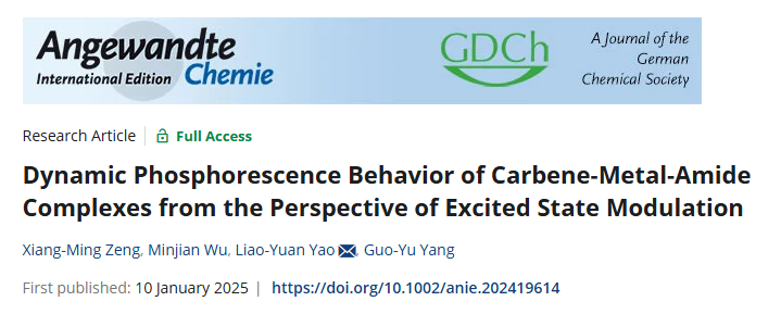 近日,麻豆传媒 姚燎原教授课题组在国际知名化学期刊《Angewandte Chemie International Edition》上发表题目为“Dynamic Phosphorescence Behavior of Carbene-Metal-Amide Complexes from the Perspective of Excited State Modulation”的研究论文。文章的第一作者为2020级化学强基计划本科毕业生(现为2024级硕士研究生)曾湘明。此项研究得到了北京市自然科学基金、国家自然科学基金、中央高校基础研究业务经费等资助以及上海同步辐射国家蛋白质科学研究设施和麻豆传媒 分析测试中心的支持。